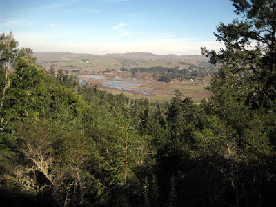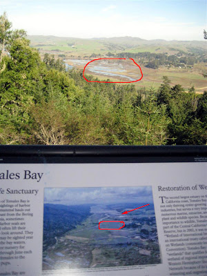 I stopped at a pull-out on the way up Limantour Rd. and took a couple photos of the newly created Giacomini Wetlands. You can see the newly flooded area and what it looked like previously in the photo on the sign. The circled area is the same.
