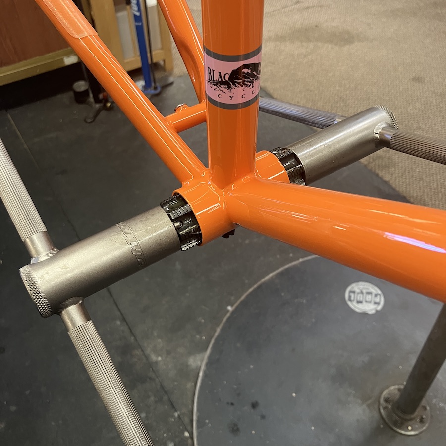 Black Mountain Cycles frames are prepped prior to paint. I don’t usually chase & face frames as a general rule as facing removes the paint that protects the raw steel and can create a space for moisture to creep in and cause corrosion under the paint.
