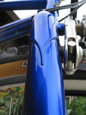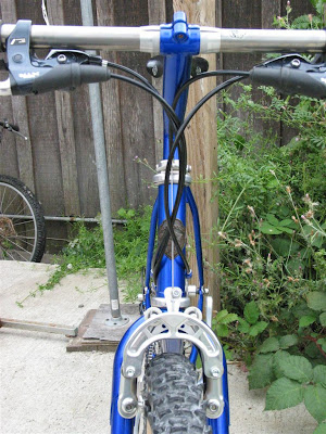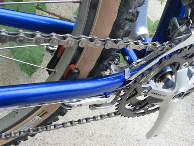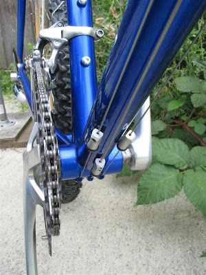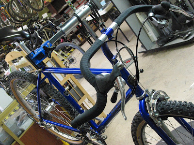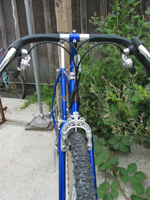 The frame was repainted by Rick at D&D Cycles. Noah collected new old parts over the years and finally, with all the parts ready, sent them out to me (he lives in NYC) for the final assembly. He wanted to easily swap between the drop bar set-up and a flat bar set-up so I installed some Ritchey cable connectors that were designed for a take-apart travel bike, but work nicely in this case to quickly swap handlebars and full controls. In fact, the original cable connectors were designed exactly for this scenario. In the early 90s, Bruce Gordon made some quick cable connect that allowed his Rock and Road bikes to be converted between drop and flat bars.