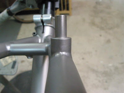So, what is in the stand? Steve Potts dropped off this ti Phoenix frame that I will be reassembling. It was sent to Steve to have the roller-cam brake bosses welded back on. For some strange reason, I’ve seen several Phoenix frames that have had their roller-cam bosses hacked off and replaced with canti brake bosses. And I do mean hacked. In this case they were simply hackedsawed off and the stubs left in place. Steve removed all trace of the canti brakes and then welded new roller-cam pivots on top of the hacked stubs. Pretty clean job and imperceptible to the all but the most scrutinous view.
