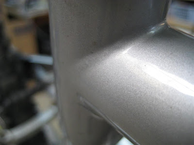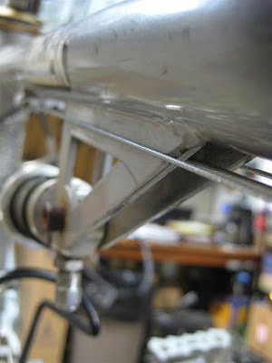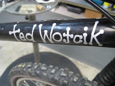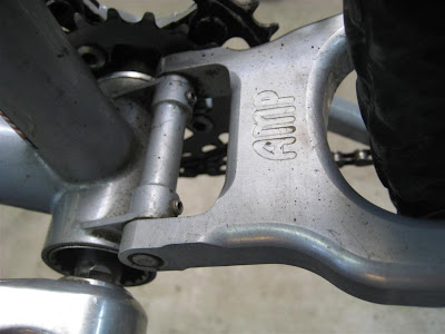This older Ted Wojcik came in to be reconditioned. Basically, it needed all new cables, brake pads, and a tube. This is a really neat bike. AMP supplied the rear end and Ted built the steel front triangle. There are some very nice details on both the front and rear.