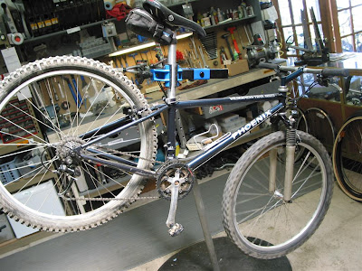 This super cool old Phoenix came in for a tune-up. This is the kind of bike that just “shows up” for service out here in West Marin. The owner of this bike bid on a tune-up I donated for a charity auction. The Phoenix is likely my all-time favorite riding frame. WTB nailed the design of this frame from the get go and it remained, essentially, unchanged throughout its 6 year production run. I don’t know anyone who has one who doesn’t rave about it and the few folks who have had one and have sold theirs off still have regrets – right Marty ๐ ?