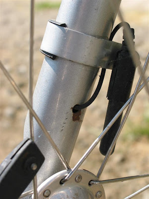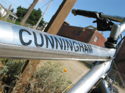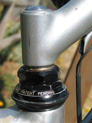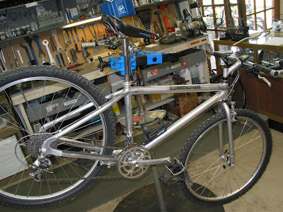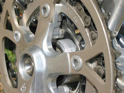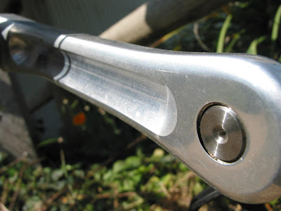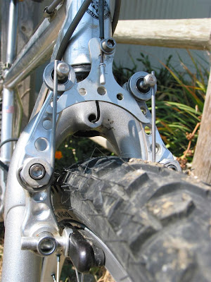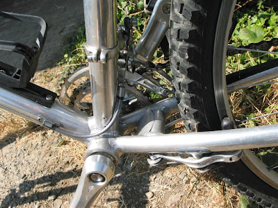 The model is the Wombat and was pretty much a women’s specific bike. It’s made light (22.09 lbs with the heavy tires currently in place) and is not designed to be abused. The stealth WTB/Chris King Grease Guard headset is nice with the black o-ring instead of the standard orange one. The cranks are also a super nice touch. Little known Specialized micro-drive cranks with Suntour 20/32/42 rings. They just barely fit around the bb-shell and Charlie also went so far as to mill the back side of the arms to lighten them up further. The internally wired cycle computer is a nice touch. Check out the shrink tubing on the front brake cable enclosing the computer wire.